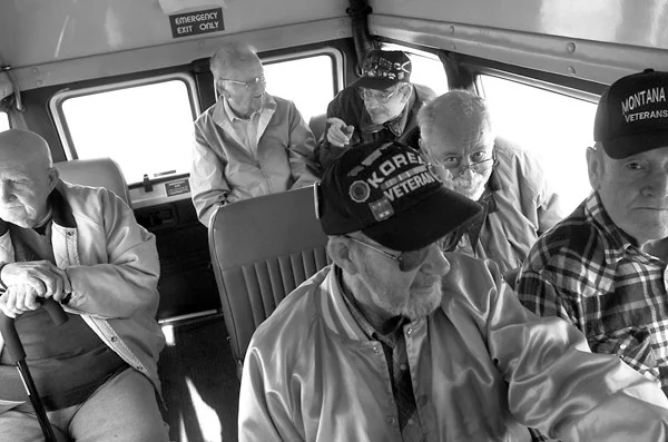 In this picture Rudy and some of the other men from home the home (in this photo there are veterans from WWII Europe, WWII Pacific, Vietnam and Korea) take a trip to either Walmart or Glacier National Park. I am pretty sure it was Walmart, but I can't remember with certainty where we were going. I know it was one of them and one of the great things about the Montana State Veterans home is it was equidistant from each. There was a limited amount of space on the vets home bus, and believe it or not, the Walmart jaunts were prized above the journeys to Glacier. Rudy attributed this to everyone's need for snacks and underwear.