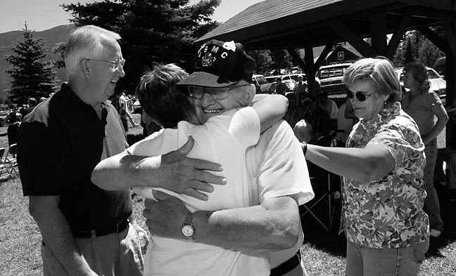 We transitioned pretty smoothly from journalist and subject to buddies. We played keno, we went for walks, and we ate a lot of breakfast. I was living in the same town with my folks, and at some point, as you do with your friends, I wanted to introduce my parents to Rudy. So I invited my folks to the Memorial Day ceremony, and here they are meeting. Rudy is hugging is my mom, and that's my dad smiling behind her.